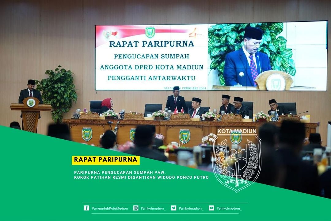 Paripurna Pengucapan Sumpah PAW, Kokok Patihan Resmi Digantikan Widodo Ponco PutroMADIUN – Satu lagi anggota DPRD Kota Madiun berganti. Dwi Jatmiko Agung Subroto yang sebelumnya duduk di kursi dewan resmi digantikan Widodo Ponco Putro. Proses pergantian tersebut berjalan khidmat melalui rapat Paripurna dengan agenda pengucapan sumpah anggota DPRD Kota Madiun pergantian antarwaktu (PAW), Selasa (20/2).